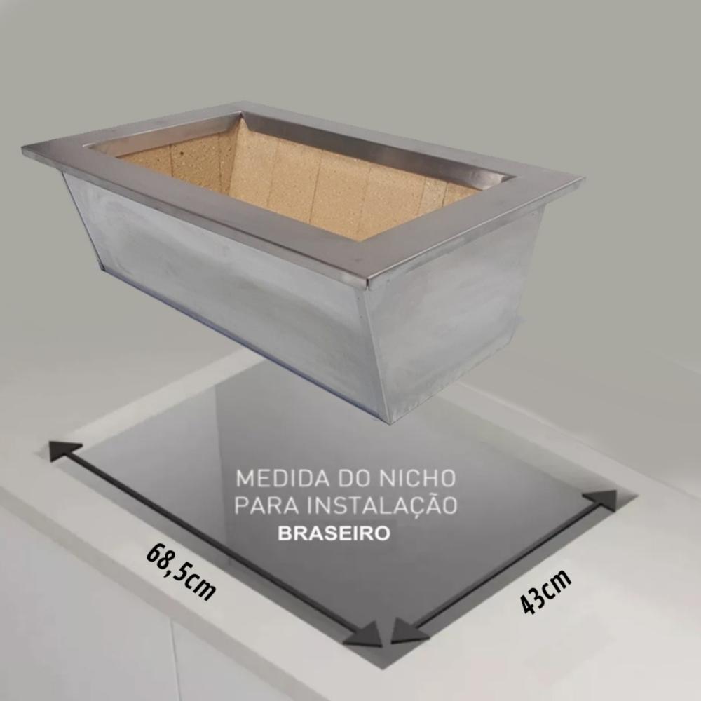 Produzido em aço inox e tijolo refratário, o braseiro suporta altas temperaturas e oferece longa vida útil, mesmo em uso intenso.