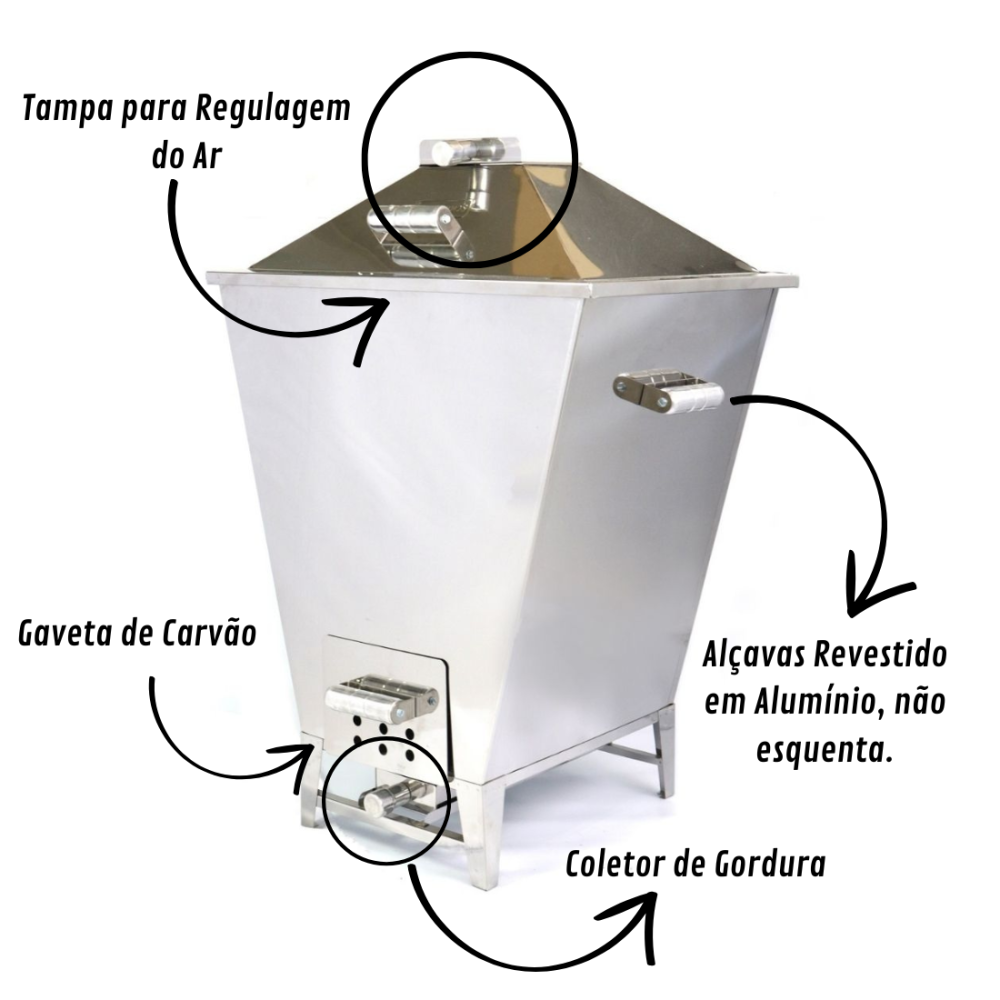 Seu sistema a bafo permite assar carnes de forma mais uniforme e suculenta, mantendo o sabor original e reduzindo o tempo de preparo. O formato compacto e o design Diamante garantem ótimo desempenho térmico, enquanto a estrutura robusta suporta até 16 kg, perfeita para churrascos familiares ou pequenos eventos.