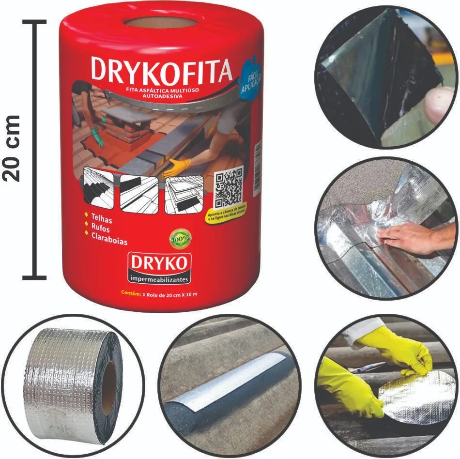 Fita autoadesiva multiuso à base de asfalto modificado com poliméricos elastoméricos, autoprotegida com filme de alumínio que permite sua exposição a intempéries e aos raios solares, sendo de fácil aplicação, na qual proporcionam medidas imediatas para solucionar problemas de gotejamento e vedações.